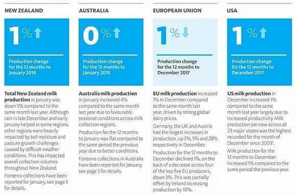最近,恒天然(Fonterra)在其官網(wǎng)上披露了2018年2月最新財(cái)務(wù)數(shù)據(jù),公司今年1月國(guó)內(nèi)牛奶產(chǎn)量同比下降5%,原因是“糟糕的天氣狀況導(dǎo)致土壤濕度不夠,進(jìn)一步影響了牧草生長(zhǎng)和奶牛產(chǎn)奶”。
