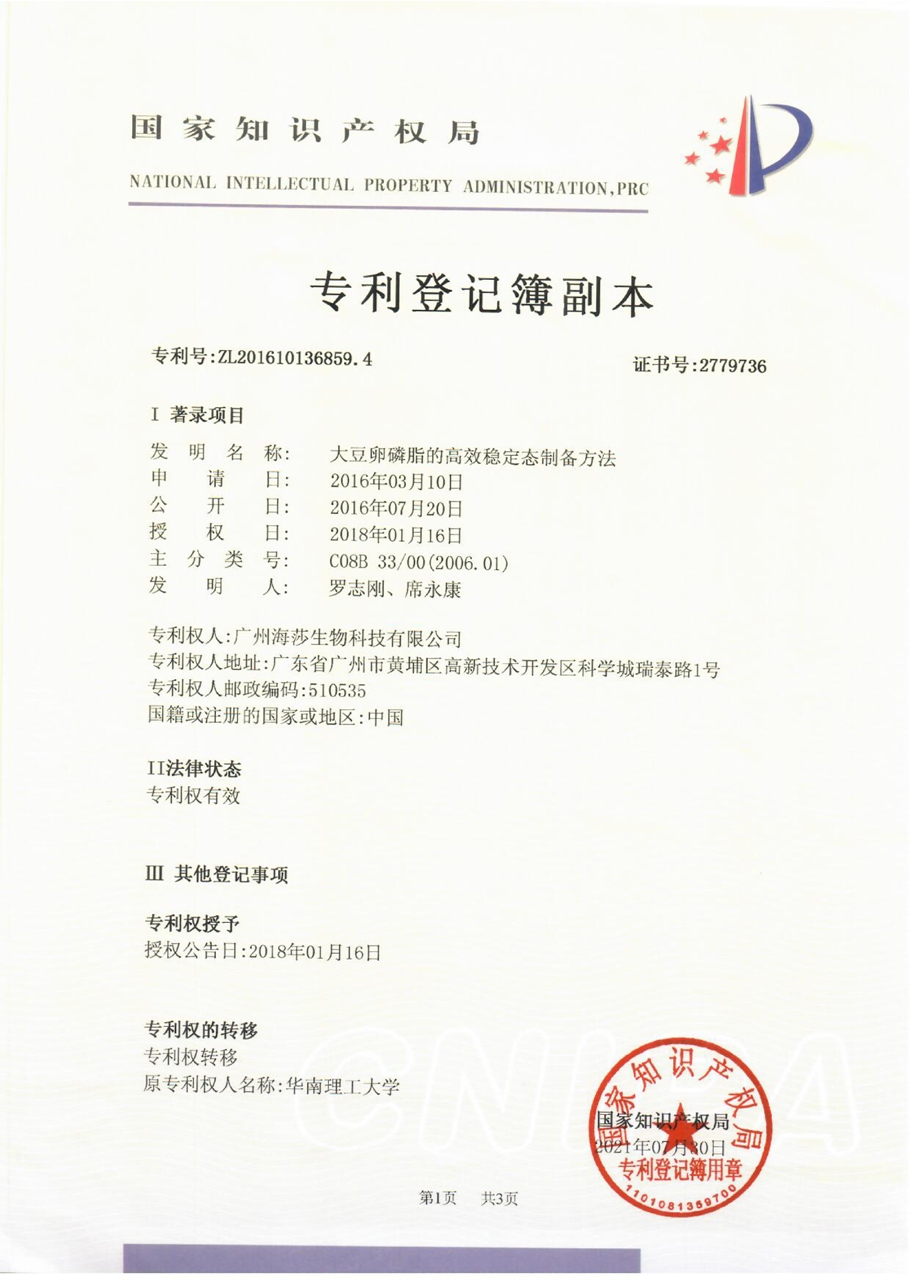 廣州海莎生物科技有限公司獲磷脂生產(chǎn)新專利,為開發(fā)高質(zhì)量磷脂 產(chǎn)品提供了保障。