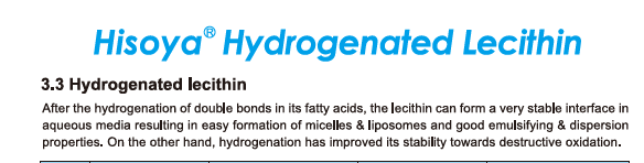 Description: Hydrogenated soya lecithin fluid, with Acetone Insluble 60% min., HLB value about 12, and Iodine value NMT 3g I2/100g.